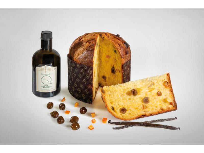 Prodotto lievitato con processo a cinque impasti arricchito da olio extra vergine d\'oliva, arancia e olive candite