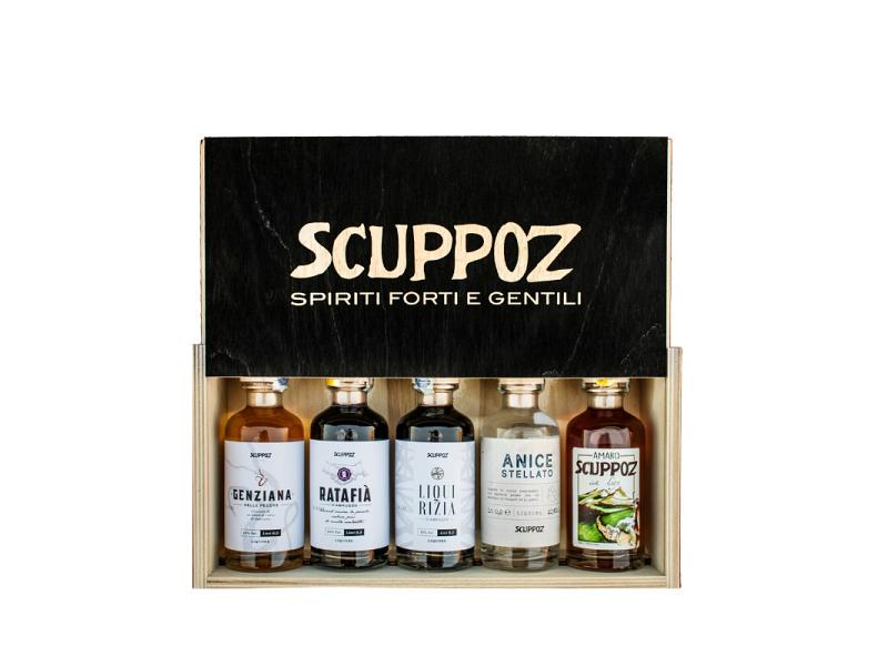 Il kit è composto da Ratafià, Liquirizia, Genziana, Anice Stellato, Amaro Scuppoz.