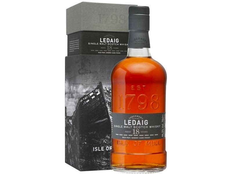 Ledaig è l\'etichetta dei whisky torbati (10 e 18 anni) di Tobermory, unica distlleria dell\'isola di Mull; Ledaig in gaelico significa “porto sicuro”, così veniva chiamato il porto di Tobermory in antichità. La versione 18 anni, invecchiata in botti ex bourbon ed ex sherry oloroso, ci accoglie al naso con note di uvetta, chiodi di garofano, arancia, un tocco di liquirizia, su uno sfondo di torba torba molto minerale e brezza marina. In bocca la torba esplode, insieme a sentori di Sherry, sale marino, tabacco, salsa barbecue, cenere, ma anche frutta e mandorla tostata, verso un finale inevitabilmente fumoso, di cenere, con un tocco di arancia e una nota legger mente speziata.